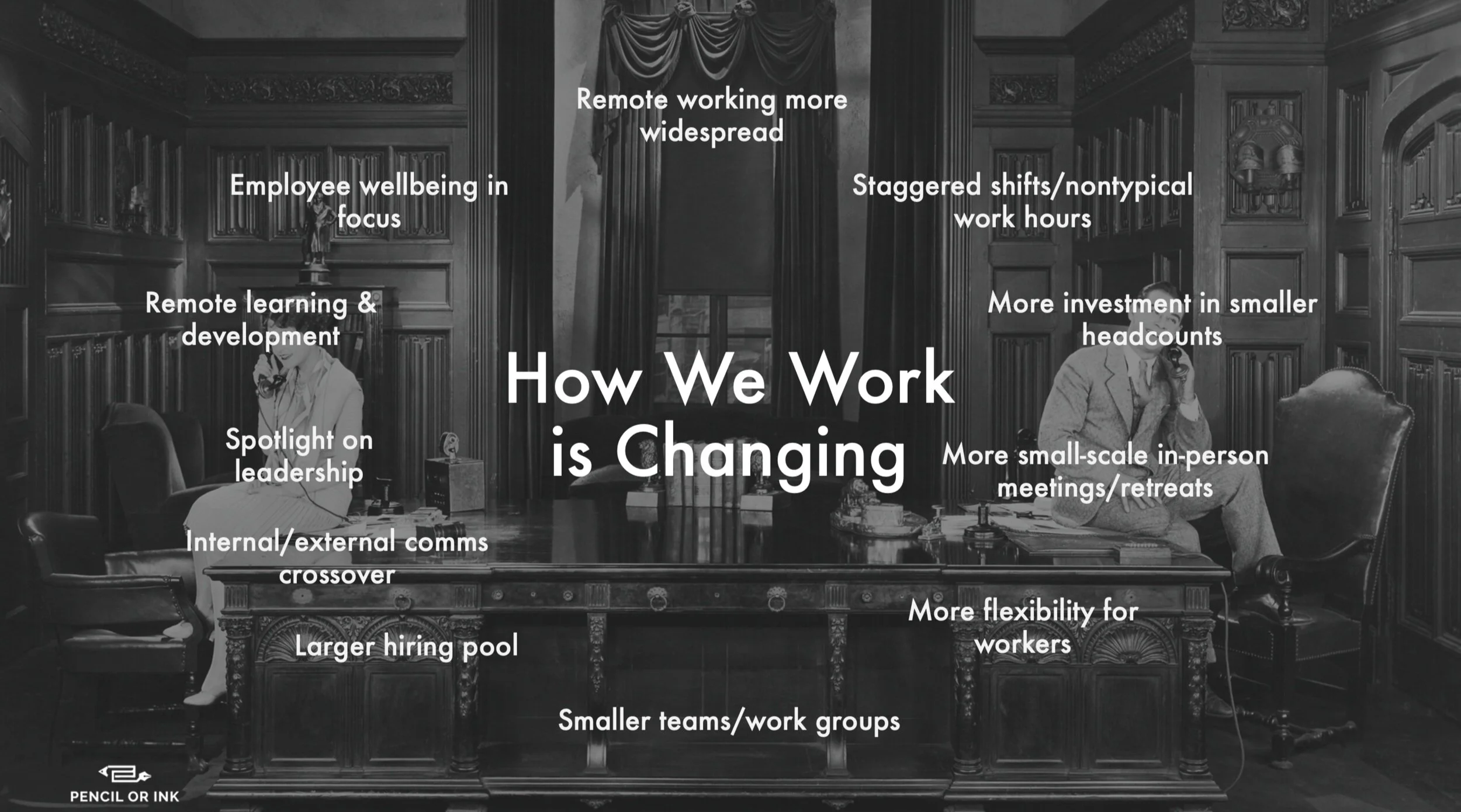 As cities and countries phase back into in-person working, staggered work shifts will help limit virus exposure by having fewer people together in the workplace at the same time. Whether this change will endure is hard to say (and hopefully a safe, effective vaccine will be developed and distributed soon), but since it comes as workplaces are also considering downsizing their office spaces and letting people go, it’s likely on the table for some businesses. This will present challenges and opportunities for workplace communications. For example, how individuals and smaller workgroups collaborate will be key.
